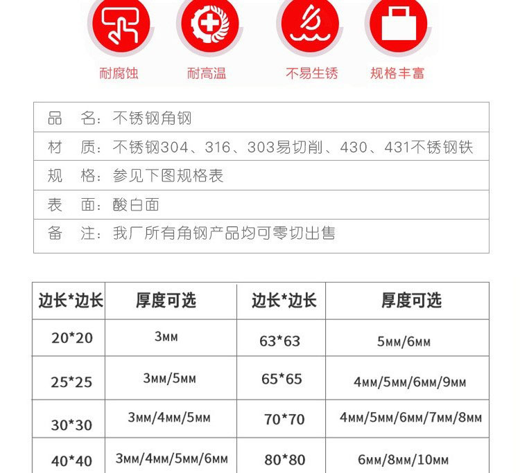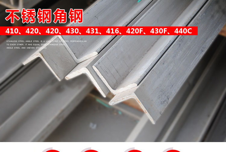 不銹鋼角鋼是兩邊互相垂直成角形的長(zhǎng)條鋼材。有等邊不銹鋼角鋼和不等邊不銹鋼角鋼之分。等邊不銹鋼角鋼的兩個(gè)邊寬相等。其規(guī)格以邊寬×邊寬×邊厚的毫米數(shù)表示。如“∠25×25×3”,即表示邊寬為 25毫米、邊厚為3毫米的等邊不銹鋼角鋼。也可用型號(hào)表示,型號(hào)是邊寬的厘米數(shù),如∠2.5#。型號(hào)不表示同一型號(hào)中不同邊厚的尺寸,因而在合同等單據(jù)上將不銹鋼角鋼的邊寬、邊厚尺寸填寫(xiě)齊全,避免單獨(dú)用型號(hào)表示。熱軋等邊不銹鋼角鋼的規(guī)格為2#-20#。
